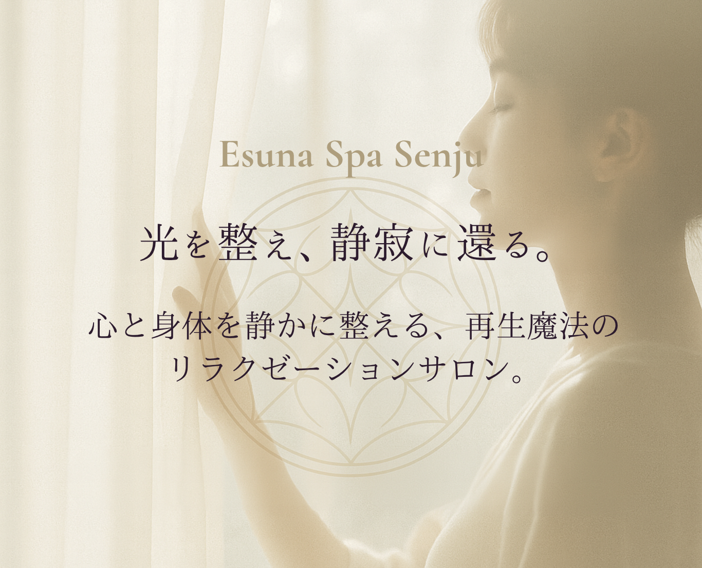 その響きを、現実の癒しへ。 Esuna Spa Senjuは、 日々の中で少しずつ曇っていく心と身体を 静かに、そして確かに整えていく“光の手”として生まれました。